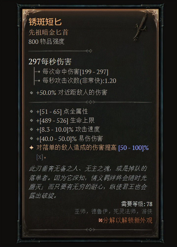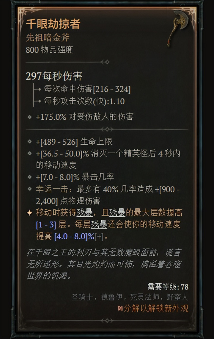 霸道东谈主、德鲁伊、死灵法师、圣骑士 德鲁伊和死灵法师可用的斧头(关于霸道东谈主和圣骑士来说,这是他们惟一不错赢得的全新劳动专属暗金):