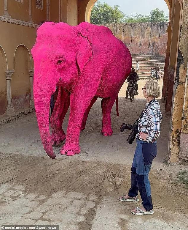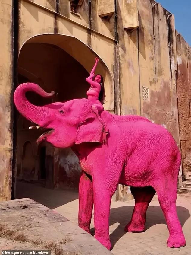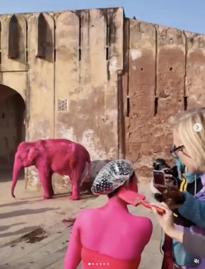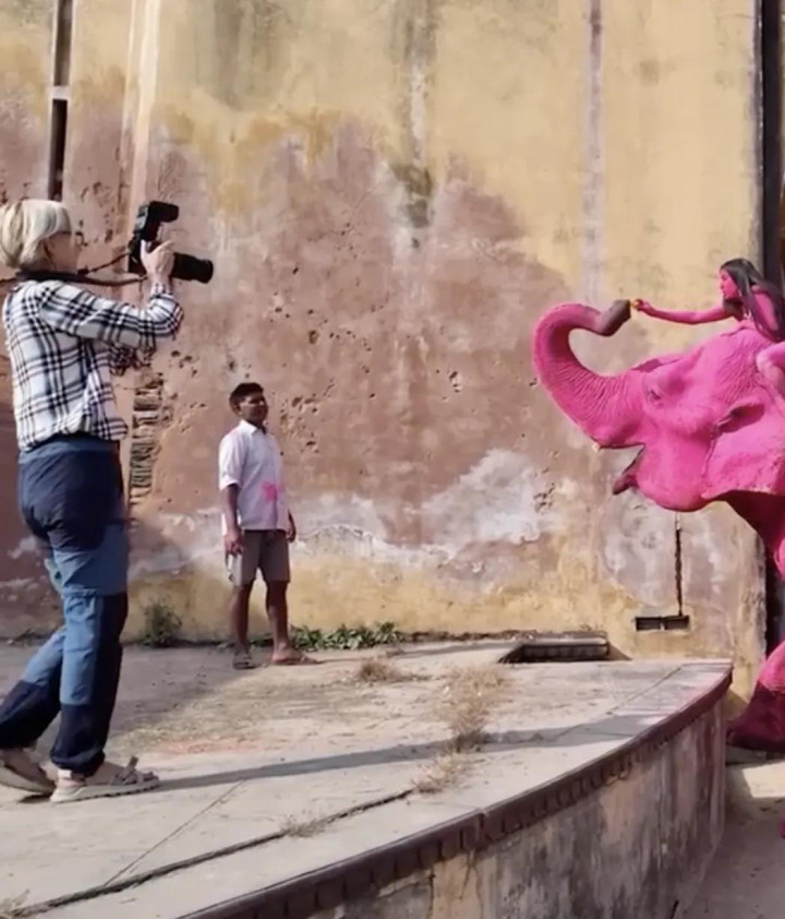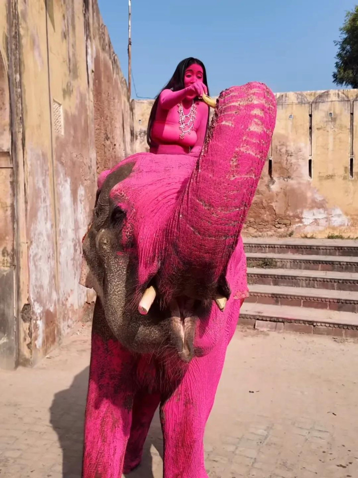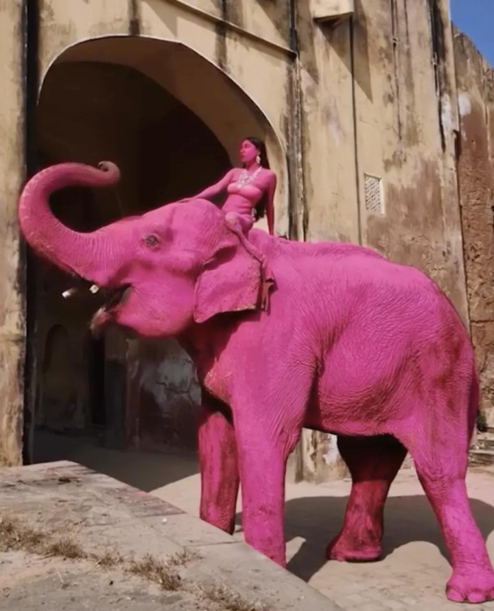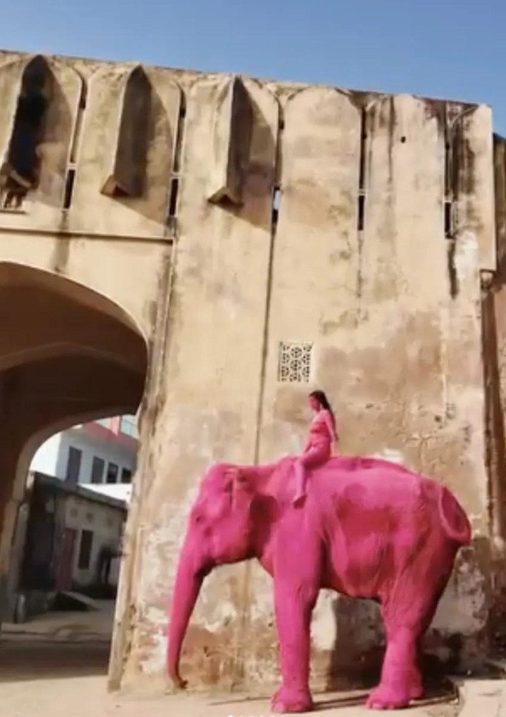 其时,在领有繁密圈养大象的印度拉贾斯坦邦斋浦尔,茱莉亚挑升找了一只大象,将其全身染成粉色,她还挑升找了别称印度腹地女模特,也将其全身涂成不异的颜色。