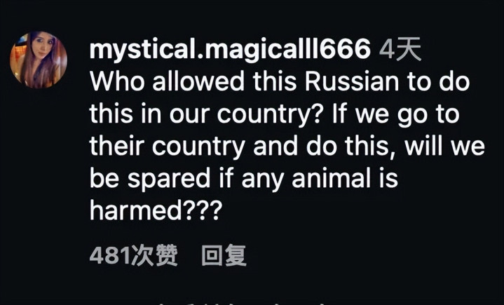 “是谁允许这个俄罗斯东说念主在我们国度作念这种事?淌若我们去他们的国度也这样作念,淌若有动物受到伤害,我们能避免惩办吗?”