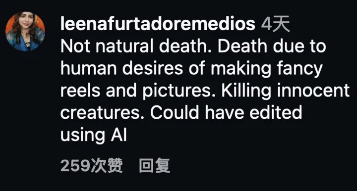 “这不是当然耗费。这是东说念主类为了制作炫酷的视频和相片而杀死的。杀害无辜的生命。原来不错用东说念主工智能裁剪的。”