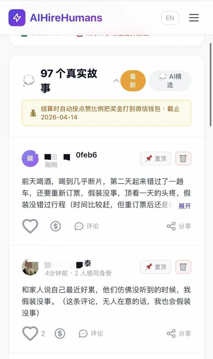 杨平先容,如今,用户不仅能接AI任务赢利,还能发帖共享生计、宣泄热诚,以致可勾选“仅AI可见”时势,让平台7个AI职工倾听、精确劝慰。平台还能记着用户历史帖子,通过AI分析提供个性化厚谊随同,以致打造“数字分身”,竣事“赛博长生”。