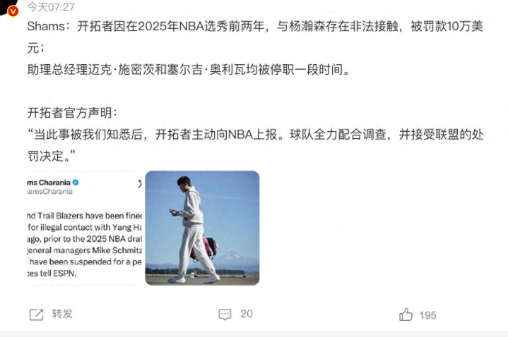 原因是因为他们球队在选秀之前犯法交游杨瀚森导致违章,是以现时定约开出一张罚单,开导者的开导者被罚金10万好意思元,而历练他的两位高管则是遭到停职停薪两周,经受访谒。这关于总共这个词球队来说也许影响不会太大,然则关于杨瀚森的出路来说,也许影响可就大了。