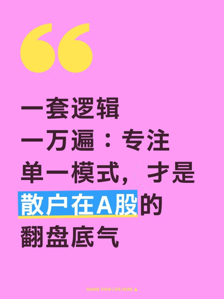 你想想,机构要计划各式风控和资金需求,计谋不可能纯正;量化要稳妥通盘股票和行情,算法势必有疏漏。唯有我们散户,船小好调头,不错选择一套最恰当我方的简便形状,心无旁骛地练一万遍,把每一个细节、每一个信号皆刻进履行里,变成别东说念主无法相比的概率上风。
