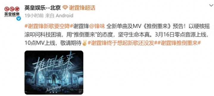 2026年3月16日,歌手谢霆锋全新原创单曲《推倒重来》(英文名:Evolution)零点音源上线,上昼10点MV上线,以硬核摇滚之声开启年度音乐新篇。网友点赞留言:骨子里还是阿谁少年。