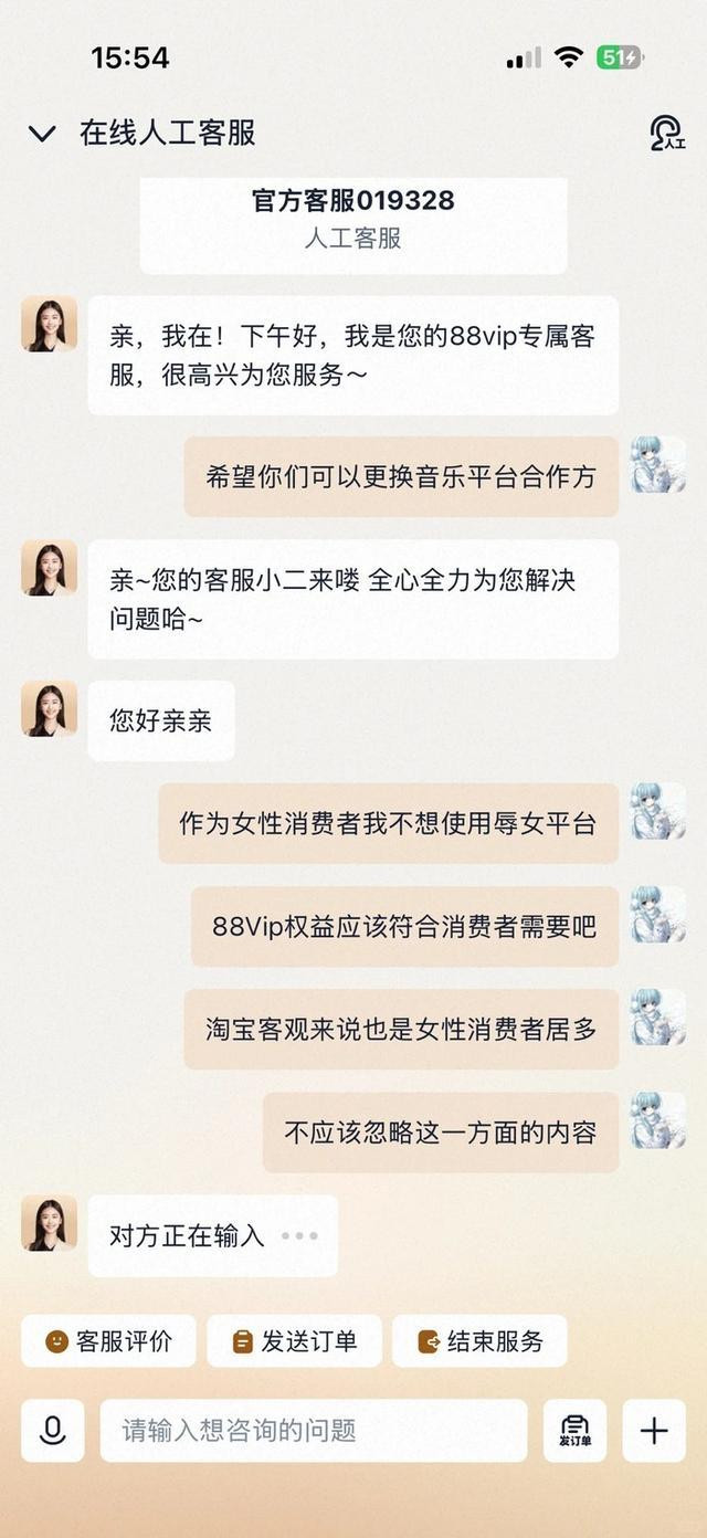 还有一部分用户将投诉延迟至外部联结方。由于网易云音乐接入阿里巴巴88VIP体系,灵验户转而向88VIP客服反馈,抒发“不肯赓续使用联系行状”“但愿更换联结平台”等诉求。这一动作,使得争议从单一居品问题,外溢至其联结生态。