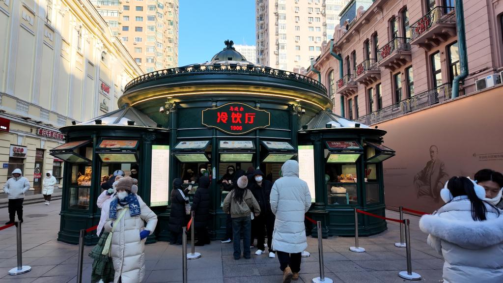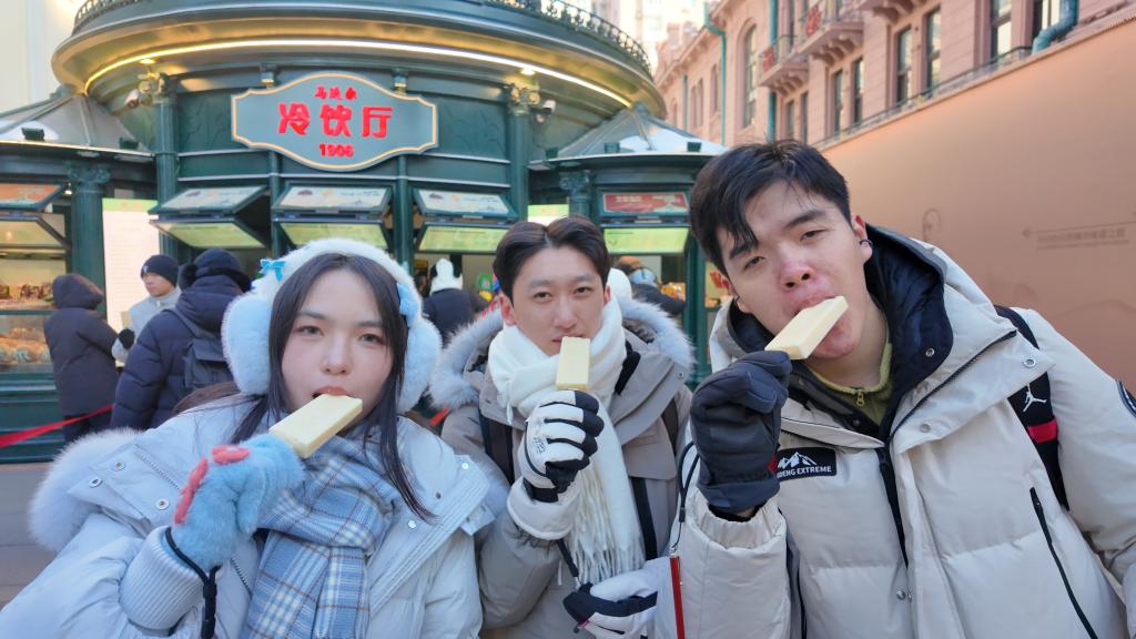 酷寒时节,哈尔滨中央大街上,东谈主头攒动。尽管冷得顿脚,但旅客们依旧入乡顺俗,要来尝一尝马迭尔冰棍。