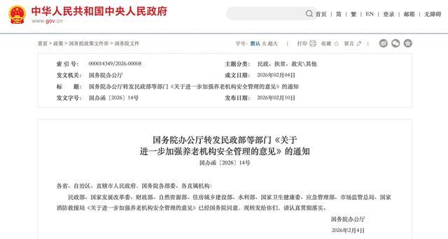 2026年2月,国务院办公厅转发了民政部等10部门蚁合制定的《对于进一步加强养老机构安全握住的观念》(国办函〔2026〕14号)。这份文献不是什么“带领观念”,而是平直礼貌了三年内必须达目的硬性手艺表和门径,隔离格的养老院,恭候它的将是照章关停并转。