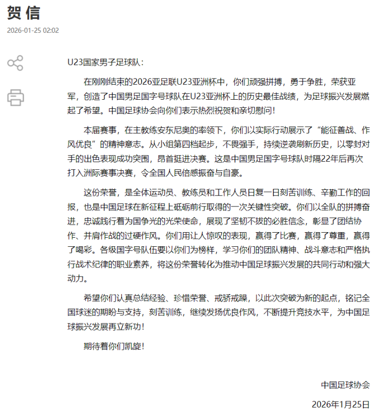 在刚刚甩手的2026亚足联U23亚洲杯中,你们轻浮拼搏,敢于争胜,荣获亚军,创造了中国男足国字号球队在U23亚洲杯上的历史最恋战绩,为足球振兴发展燃起了但愿。中国足球协会向你们默示强烈祝福和亲切慰问!