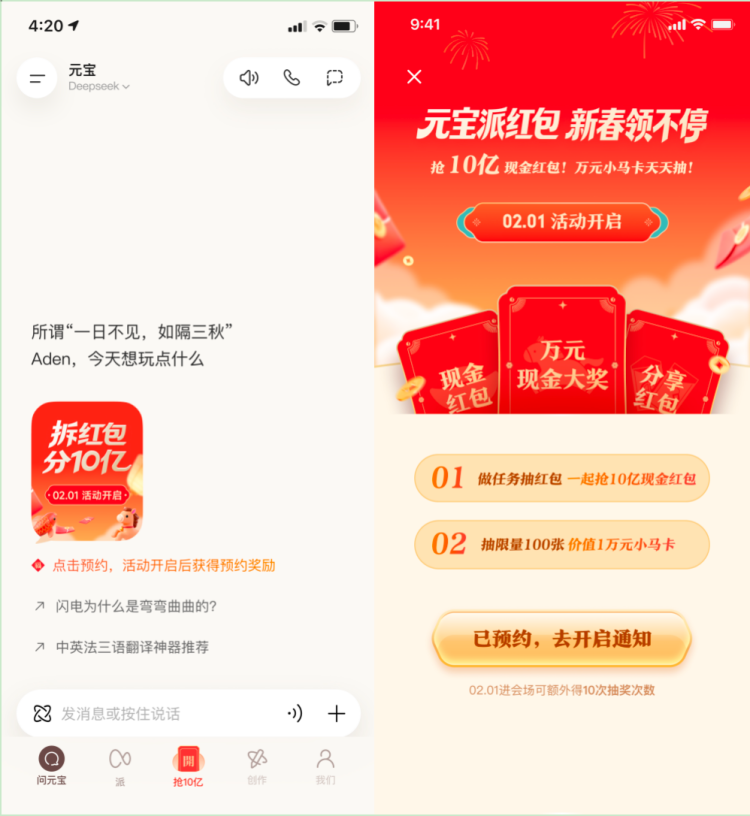 官方先容,1月25日,元宝App更新到最新的2.55.0 以上版块,点击主页的预约卡片即可干预春节会场预约页面,提前预约的用户将在2月1日举止开启今日,特等获取10次抽奖次数。