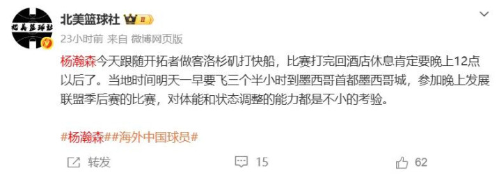 由于前一天杨瀚森还在随从开垦者客场对阵快船,然后才从洛杉矶飞往墨西哥,舟车坚苦外加高原反映显着看出他在PK墨西哥城队长比赛中躯壳气象欠安容易疲顿,导致其上半场出战时分被切得迫害,约15分钟里投篮4中2获取4分3板1助1帽。